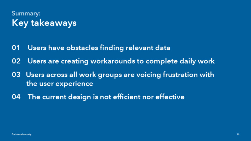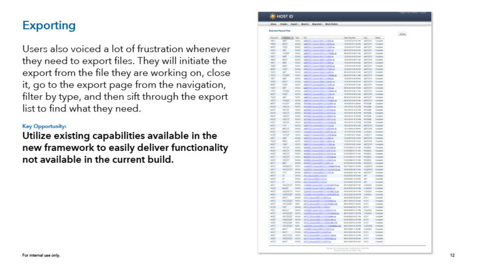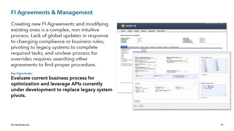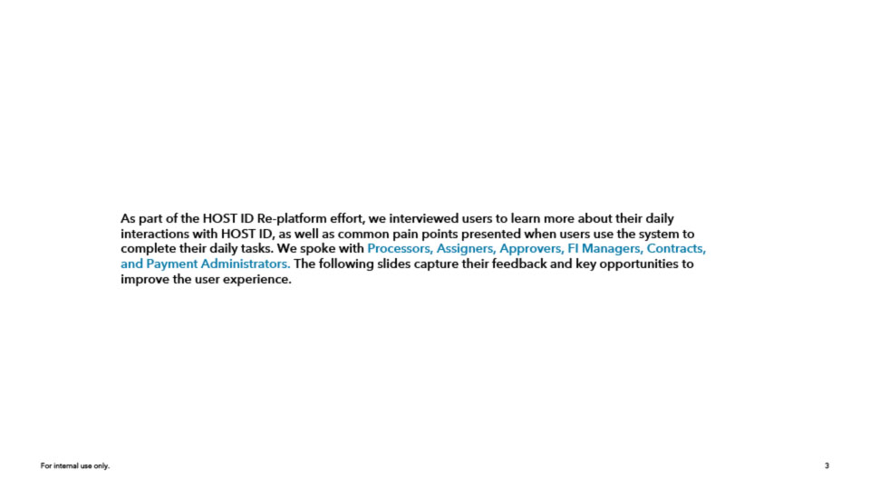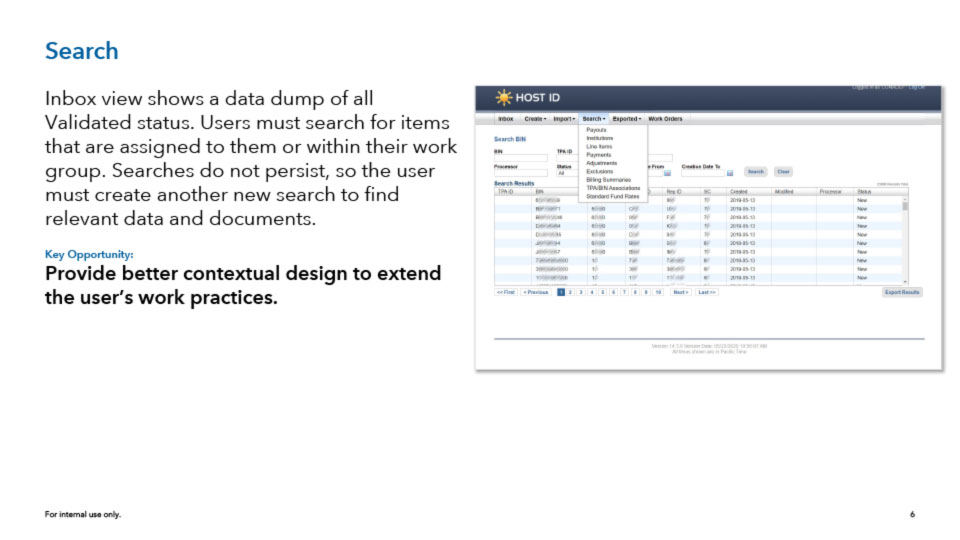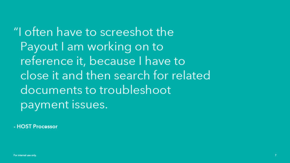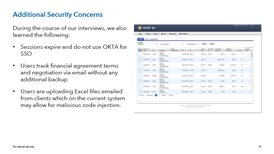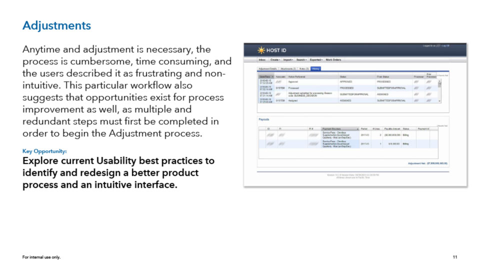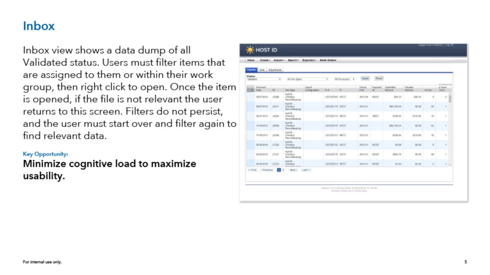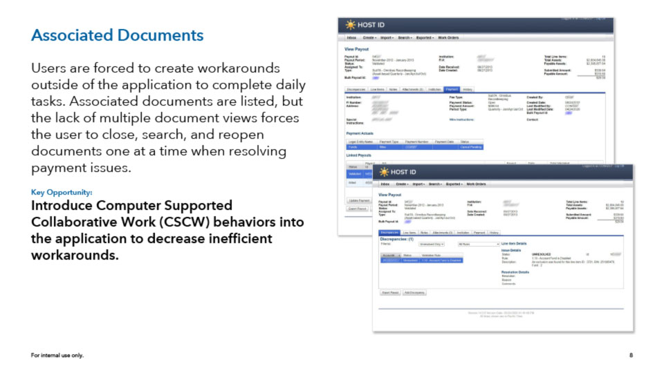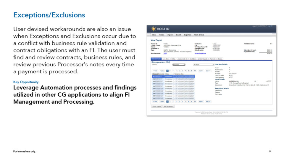 Presentation of findings and high level recommendations after interviewing a cross section of users in a department that handles payment fee processing for Financial Institutions.