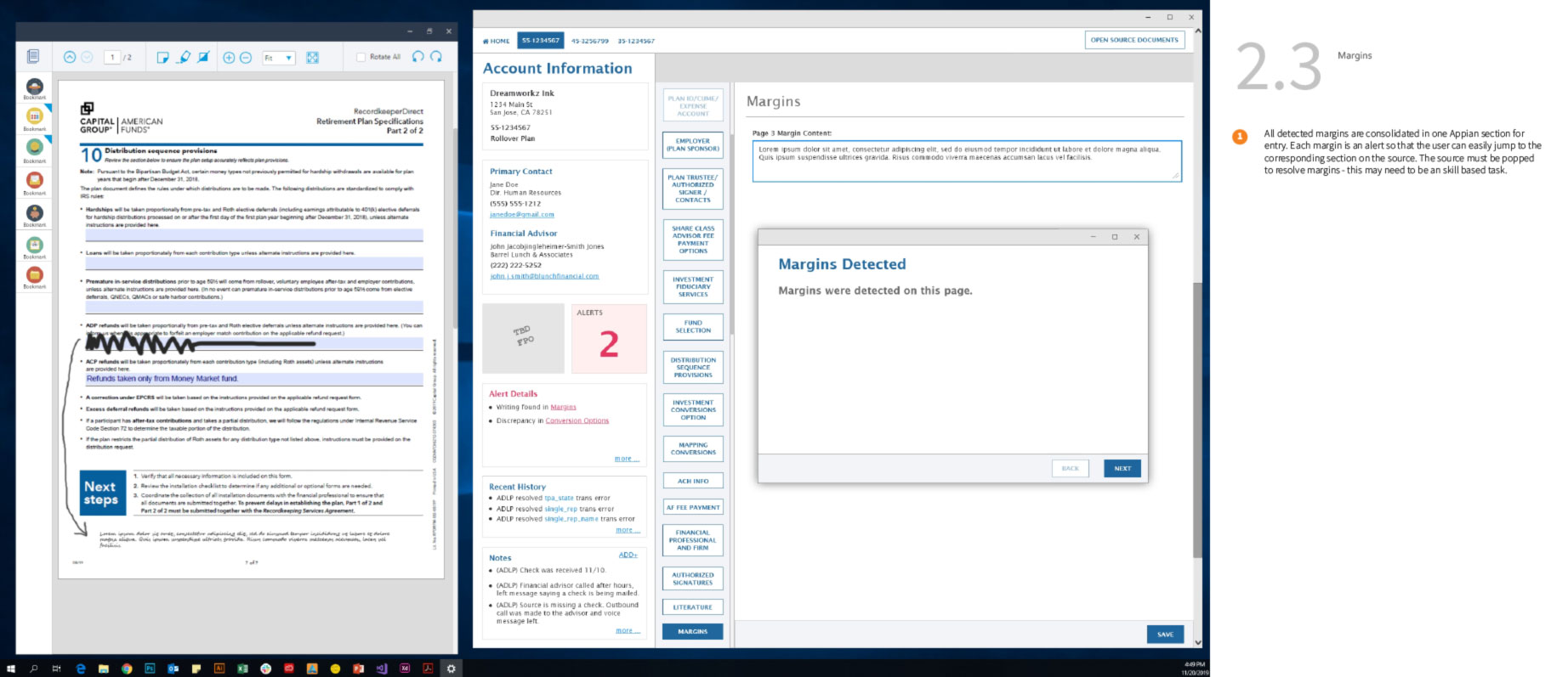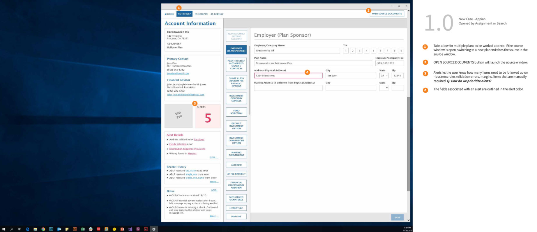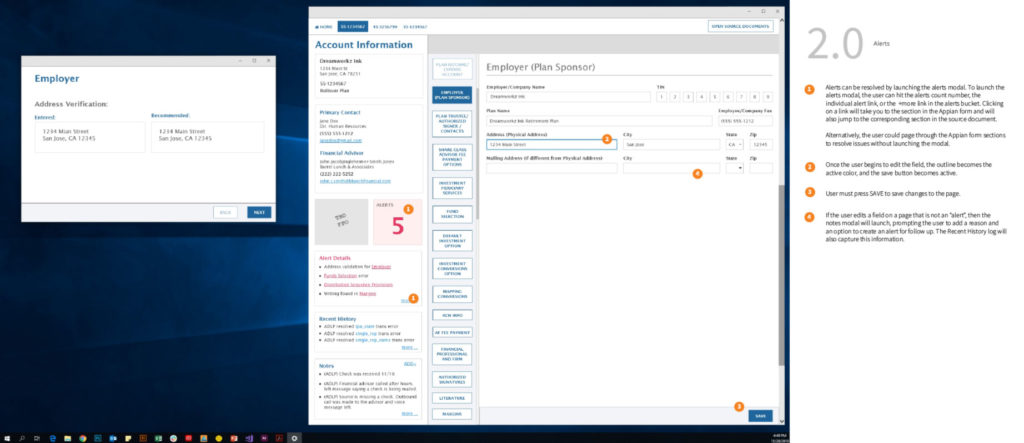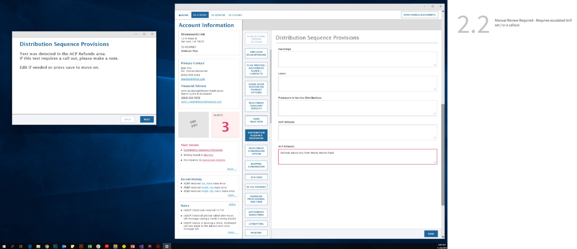 Wireframes for redesign of Retirement Plans with mailed-in forms on an Appian platform (above). These wireframes solve for exceptions that arise after the form has been digitized and the data has been entered, however, a discrepancy remains and an associate must make a phone call to the client to resolve.