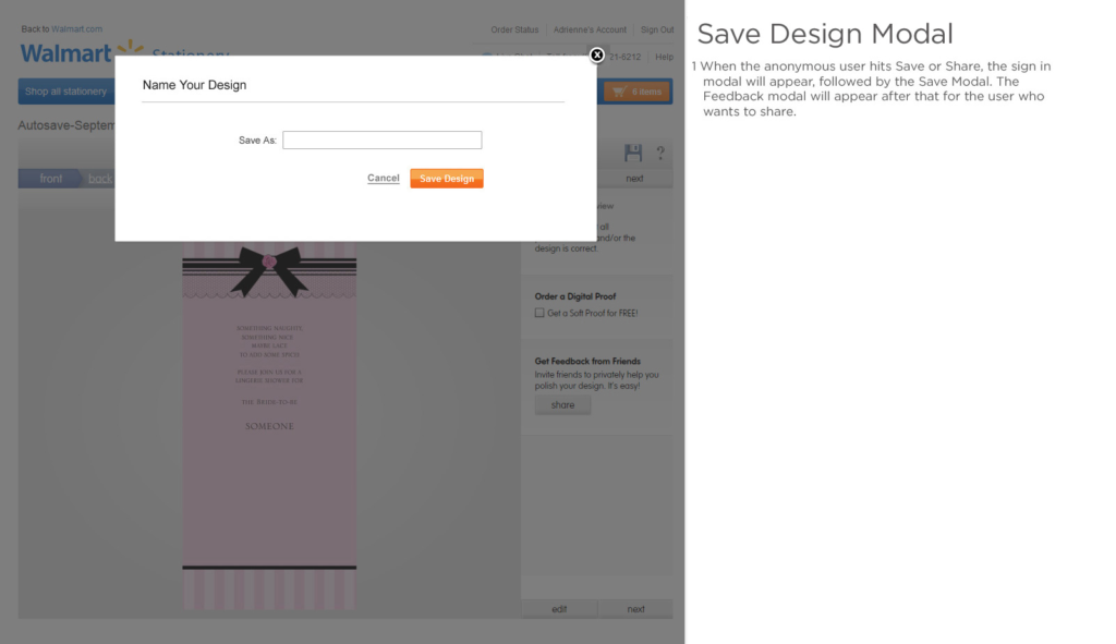 Save & Share during stationery customization was one of the most important and largest of the oversights, as it was a key feature that drove conversion on the previous platform. Of the users who utilized Save & Share, those users were 30% more likely to complete the purchase funnel. The new platform presented an opportunity to add additional functionality, and also to position the feature to increase user engagement.